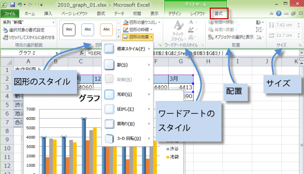 書式タブは、グラフ要素に対して図形やワードアートのスタイルを設定できます。