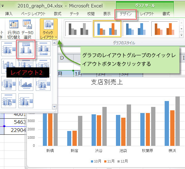 次に、リボンに現れたグラフツールのデザインタブをクリックし、グラフレイアウトのクイックレイアウトボタンをクリックします。 11種類のレイアウトの一覧が現れました。