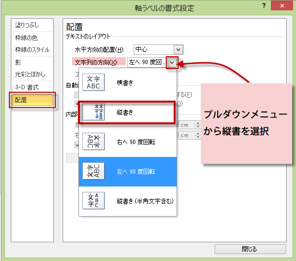 軸ラベルの書式設定ダイアログが現れます。右側にあるメニューから配置をクリックして、文字列の方向の矢印をクリックして、プルダウンメニューから縦書を選択します。