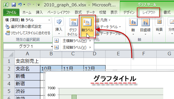 Excel2010でグラフタイトルを追加する時は、グラフツールのレイアウトタブから