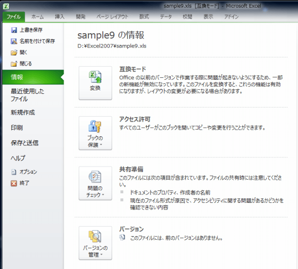 Excelの2010以前のファイルを開くと、情報タブでは、互換モードが表示されています。ファイルを2010形式に変換したりできます。