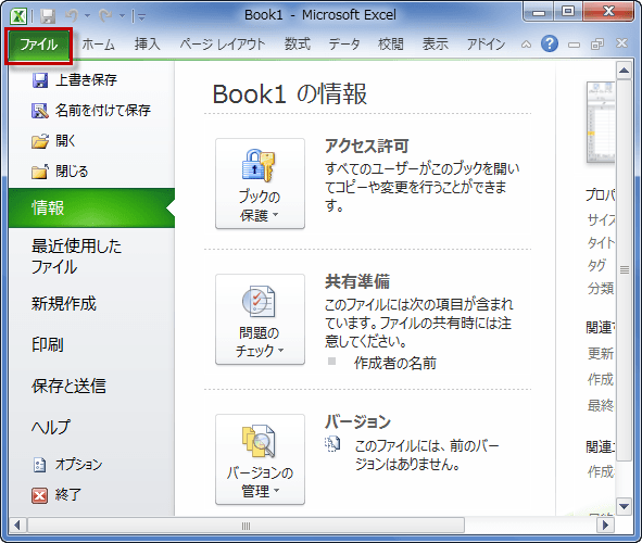 Excel2010でファイルタブをクリックすると、Backstage ビューが開きます。
