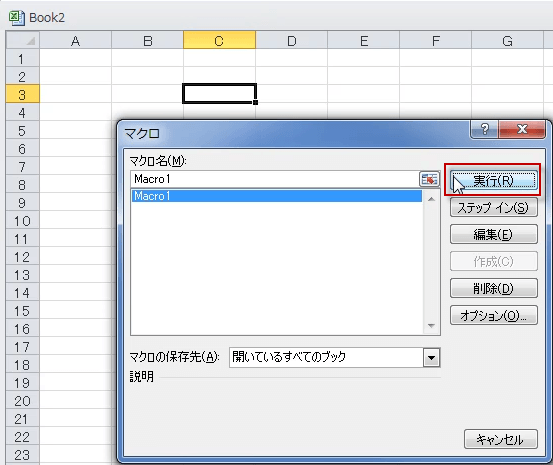 短いマクロですので、実行と同時にマクロダイアログボックスが消えて行きました。