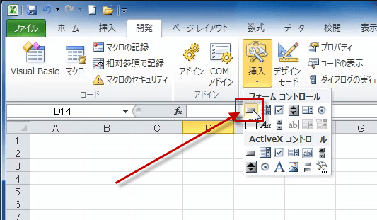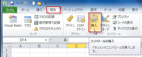 シート内にマクロ実行用のボタンを追加したいときは、まず、[開発] タブの[コントロール]グループにある[挿入]ボタンのをクリックします。