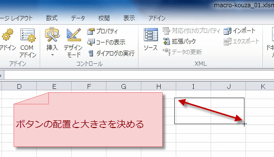ドラッグしながら、ボタンの配置と大きさを決めます。