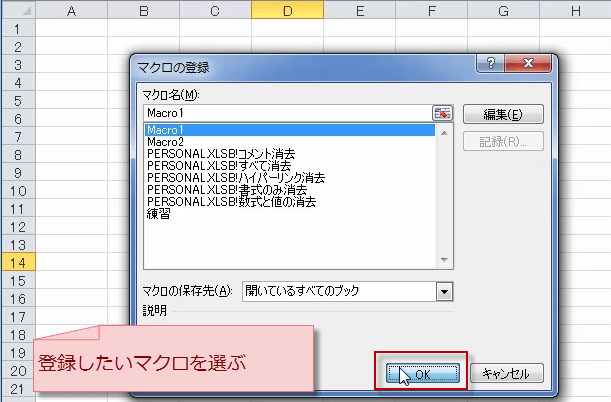 続いて「マクロり登録」ダイアログボックスが表示されるので、登録したいマクロを選んでください。