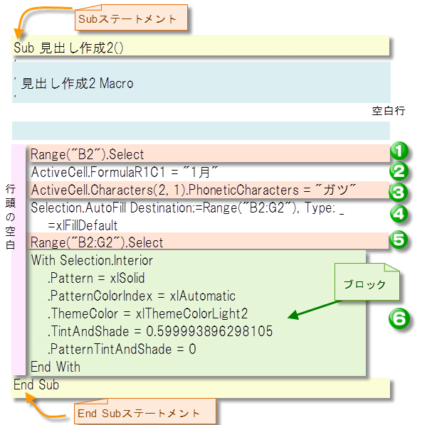 ステートメントとは、「セルB1を選択する」といった内容を表す、1つの完結した命令文です。