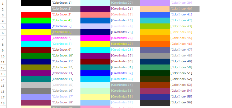このままでは、文字色が薄くて見ずらい場合あるので、好みの背景色(グレーなど)を付けて利用してください。下記にColorIndexの一覧表を表示しました。Index番号を知りたい時にご利用ください。