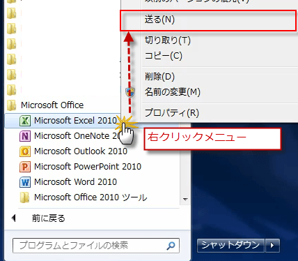 デスクトップにショートカットを作成するには、スタートメニューでExcelを表示して、右クリックメニューから送るを選択します。