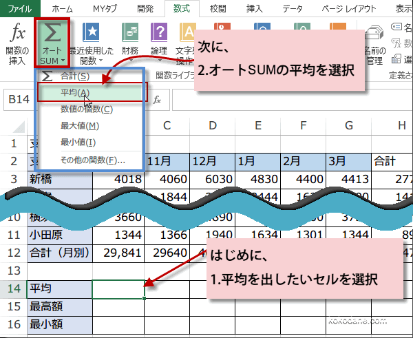 はじめに、平均値を出したいセルを選択し、次に、オートSUMボタンの平均をクリックします。