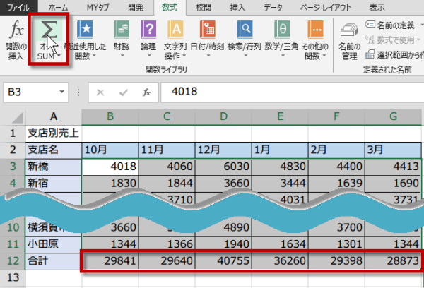 オート SUMボタンをクリックします。すると、いっぺんに12行目のセルに3行目から11行目までの合計がまとめて表示されました。