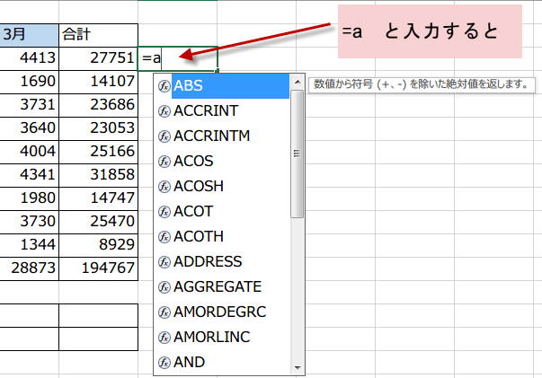 数式オートコンプリートが機能して、その頭文字で始まる関数名が一覧で表示されます。