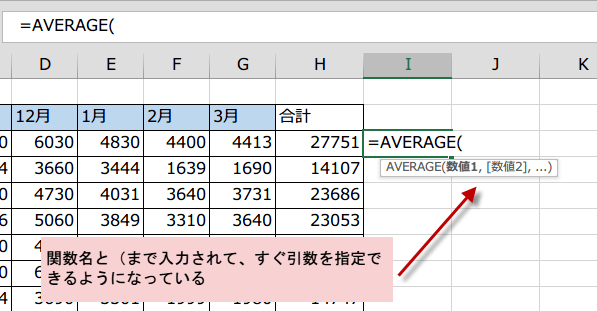 =関数名( まで入力されていて、すぐに引数を指定できるようになります。