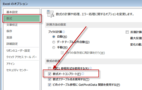 数式オートコンプリートのチェックを入れたりはずしたりで切り替えます。