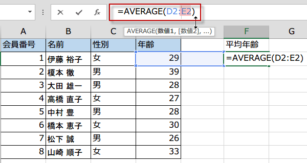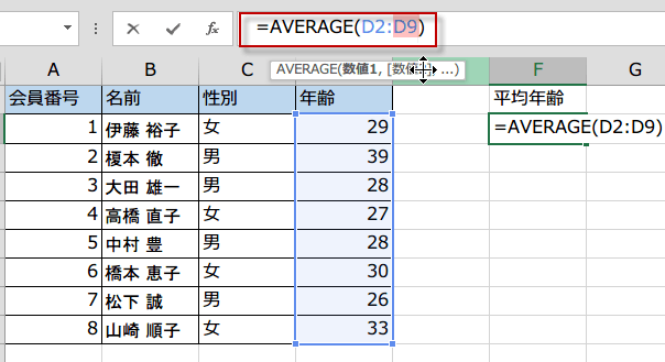 =AVERAGE(D2: にカーソルを入れて、