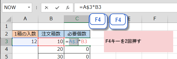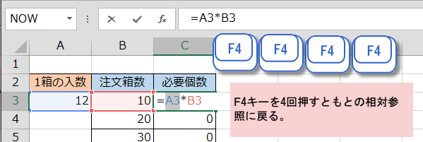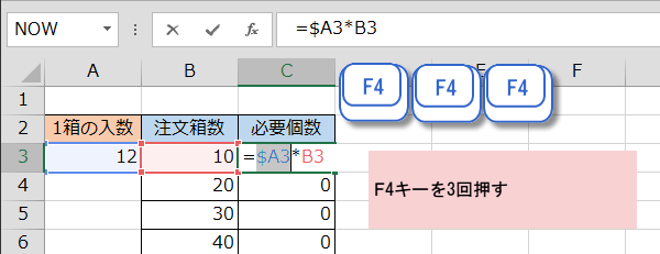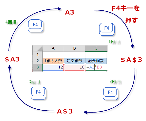 セル参照の行と列のいずれか一方の先頭に$をつける形式を複合参照と呼びます。F4キーを1回押すごとに、数式中のA3が、「$A$3」「A$3」「$A3」「A3」と変化します。