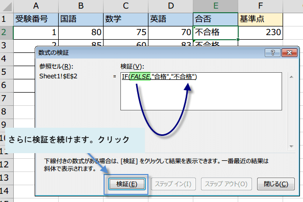 数式の検証機能を使うには、数式を検証するセルをクリックし、