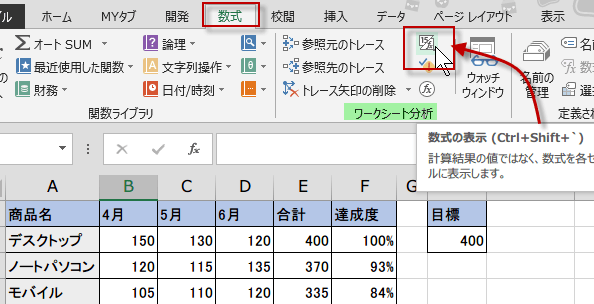 エクセルでシートに入力してある数式や関数を表示したい場合は、数式の表示ボタンをクリックします。