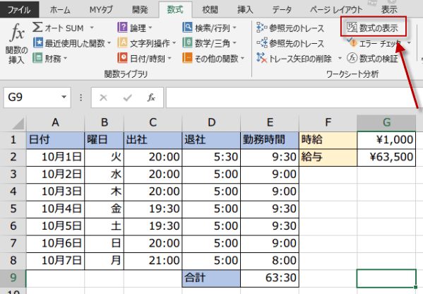 たとえば、以下の時給の計算の表にある数式を表示してみます。