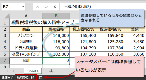 ステータスバーにも循環参照しているセルが表示されています。