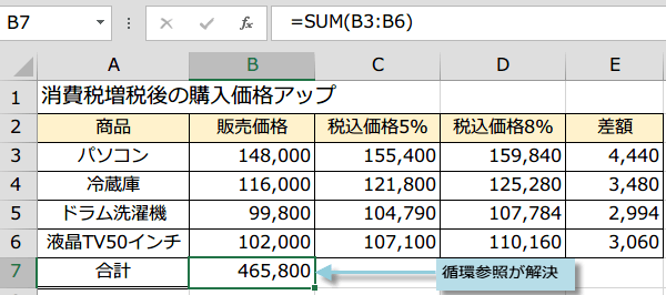 そのセル自体を参照しないように、選択したセルの数式を修正します。
