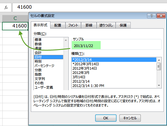 下の図の例では、41600と入力して、この数値がシリアル値として何日を表すのかを見たところ、2013/11/22ということがわかりました。