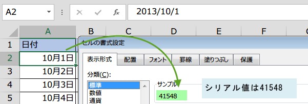 Excel上では、シリアル値が割り当てられていて、書式で見かけを日付として表示しているのだということを確認できます。