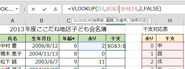 次に、干支は、VLOOKUP関数を使用して、干支対応表の2列目から表示します。