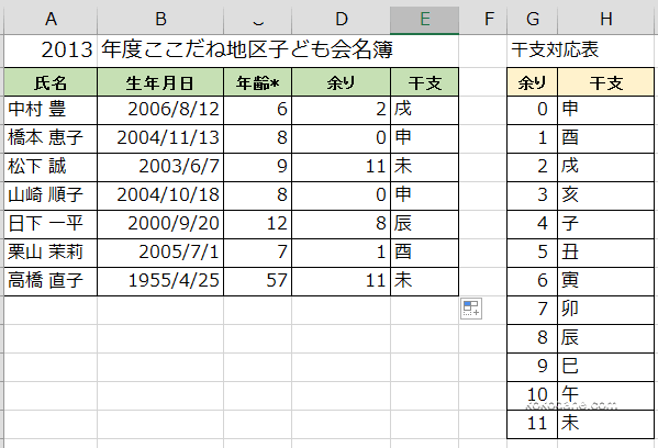 生年月日から干支を表示したい場合、子供会の名簿の学年の説明と同様に干支の対応表を作っておきます。
