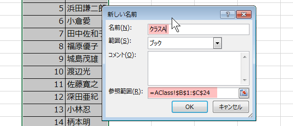 名簿のクラスごとに名前をつけ、範囲を指定します。これをクラスの数だけ作成します。