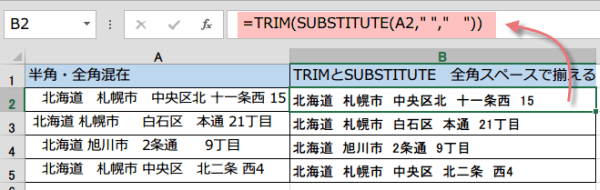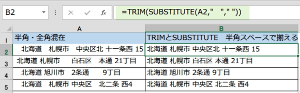 語句間のスペースを半角に揃えたいなら、SUBSTITUTE関数で、全角スペースを半角スペースに変換してから、TRIM関数で余分なスペースを削除します。