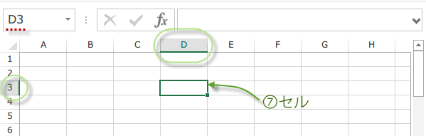 セルは、データを入力する部分。文字や数字や数式を入力します。行番号と列番号を組み合わせてセルの位置を表示します。