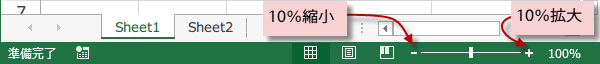 左右にある縮小、拡大ボタンは、クリックごとに10%表示の縮小、拡大ができます。