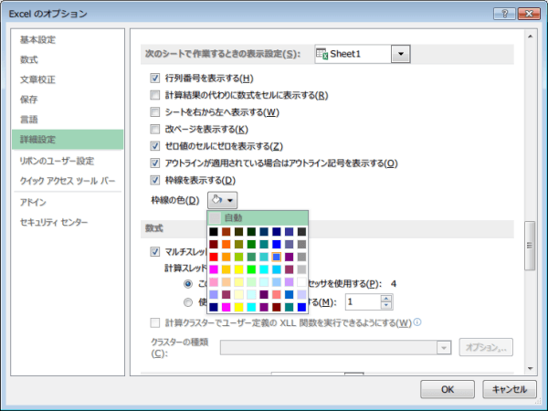追加したシートの枠線の色も変更したい時は、先ほどと同様に次のシートで作業するときの表示設定の枠線の色ドロップダウンリストで選択します。