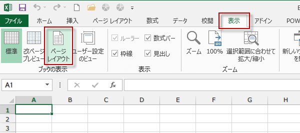 ページレイアウトを終了したい時は、「表示」タブをクリックして、「ブックの表示」グループの「標準」をクリックします。