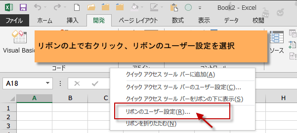 リボンを右クリックして、表示されるメニューの「リボンのユーザー設定」をクリックします。