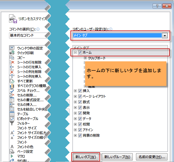 次に、登録したいタブの上にくるタブを選択し(例では「ホーム」を選択)、「新しいタブ」をクリックします。