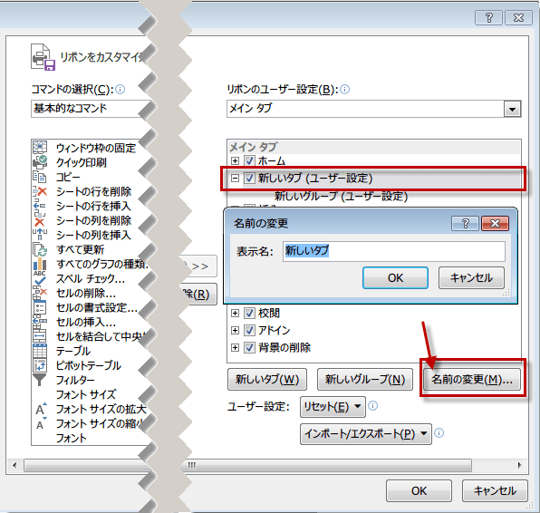 「新しいタブ(ユーザー設定)」を選択して「名前の変更」ボタンをクリックします。