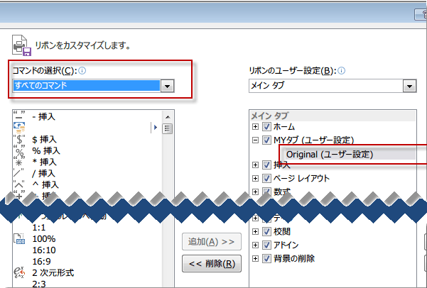 再び、リボンのユーザー設定から、新規作成したグループを選択し、画面左側の「コマンドの選択」ボックスをクリックして、表示された一覧から任意のコマンドリストをクリックします。