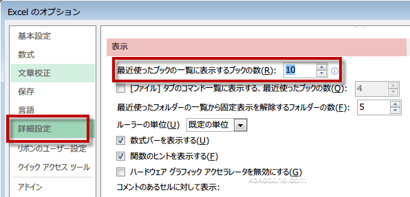 最近使ったブックの一覧に表示されるブックの数を変更するには、ファイルタブのオプションを選択して、最近使ったブックの一覧に表示するブックの数で変更できます。