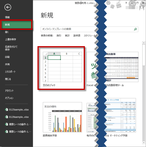 新しいファイルとして作成を開始したいときは、「空白のブック」をクリックします。