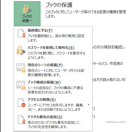 ブックの保護ボタンをクリックすると、保護のメニューが表示されます。