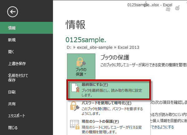 情報タブにはブックの保護という項目があります。最終版にすると、ブックは読み取り専用になり、内容を変更することができなくなります。