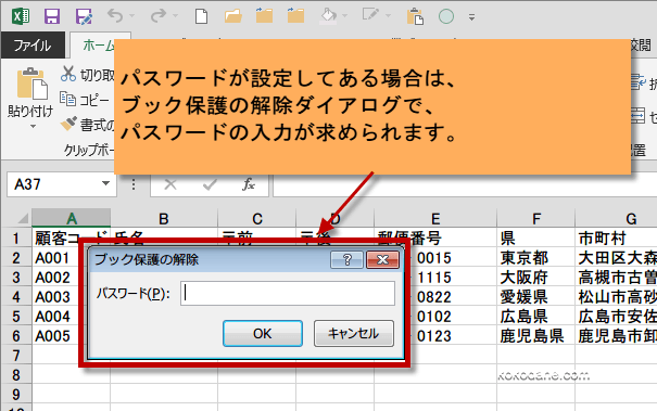 もし、パスワードを設定していた場合は、ブック保護の解除ダイアログで、