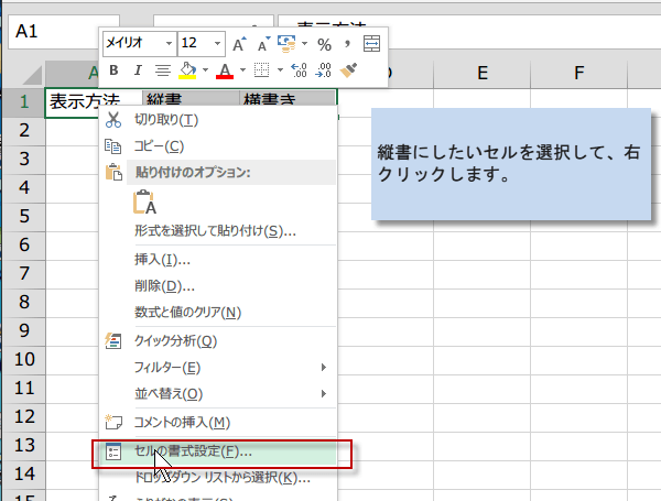 縦書にしたいセルを選択して、右クリックします。