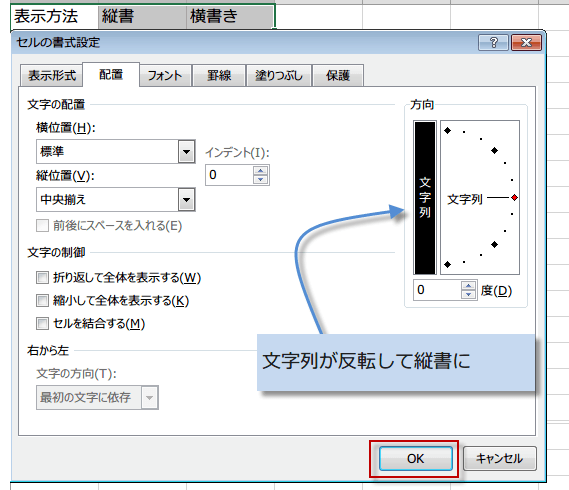 セルの書式設定でセルの文字を縦書にするには、