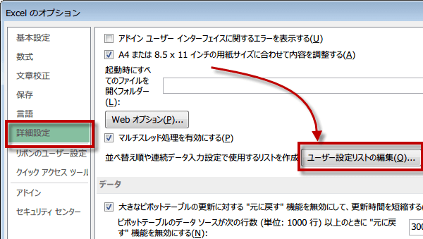 Excelのオプションダイアログが表示されたら、詳細設定を選択します。