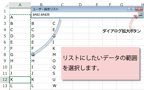 アルファベットのA~Zを登録します。リスト項目(E)に直接入力しても新規リストを追加することもできます。