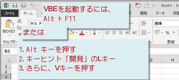 VBEの起動は、ショートカットキーでは、Alt+F11