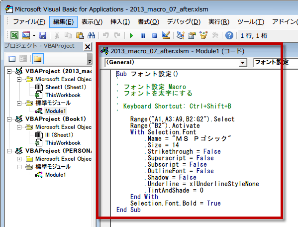 マクロ講座7回で作成したマクロの記録「フォント設定」を見てみましょう。